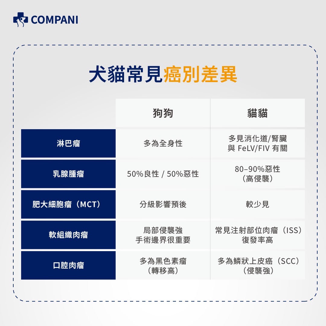 根據 2026 年 AAHA 犬貓腫瘤指南,犬貓在腫瘤發生率、常見類型、生物行為以及診斷與治療建議上存在顯著差異 。以下是更詳盡的對比與重點整理: